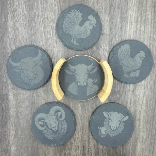 Ajoutez une touche rustique et authentique à votre table avec ce magnifique set de 6 sous-verres en ardoise. Chaque sous-verre est gravé avec soin de motifs uniques représentant des animaux de la ferme  accompagnés de leurs petits… taureau, vache et veau, bélier, brebis et agneau, coq, poule et poussins!